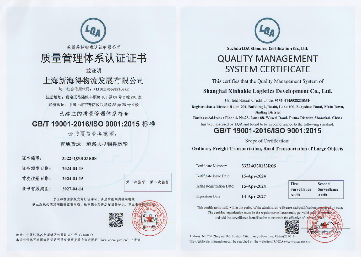 新海得物流嚴格按現代物流操作流程進行標準化運作。已通過國際質量管理體系ISO9001:2015體系認證。運用健全的客戶服務管理系統、車輛管理系統,財務管理系統。在查詢、監(jiān)控、追蹤、結算等方面與客戶做到無縫對接,打造了專業(yè)高效的客戶服務體系。